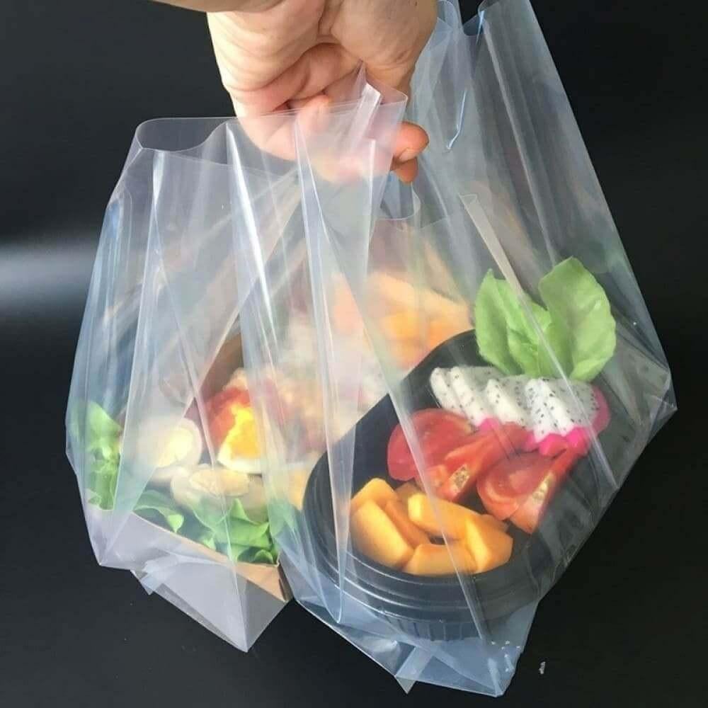 - أكياس بلاستيك شفافة بقاعدة سفلية كبيرة للتسوق ولشحن الطلبات والأطعمة .
