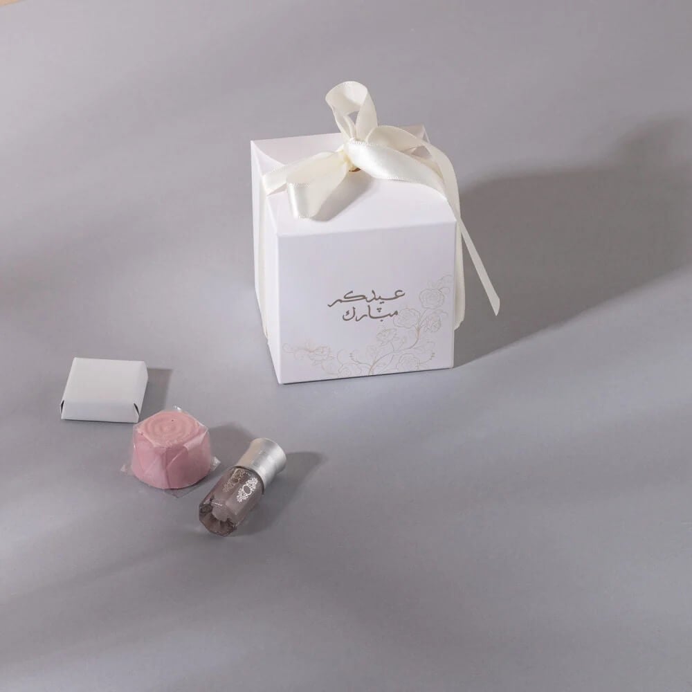 - تصميم عملي وفاخر مزود بشريطة قماشية وعبارة "عيدكم مبارك".