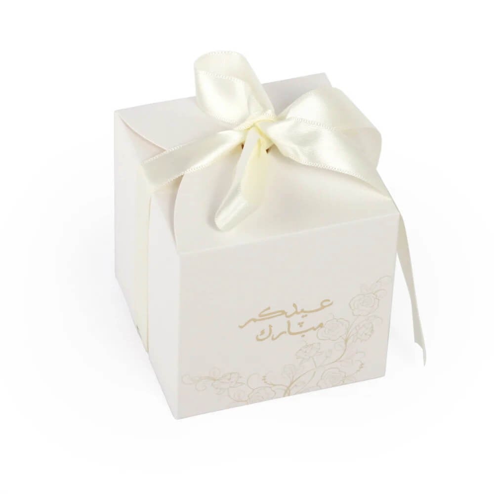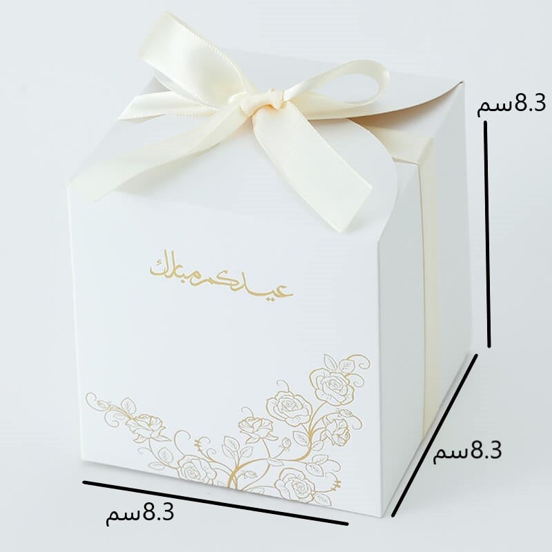 علب توزيعات العيد باللون الأبيض بزخرفة ذهبية وتصميم فاخر مع شريطة وعبارة "عيدكم مبارك"